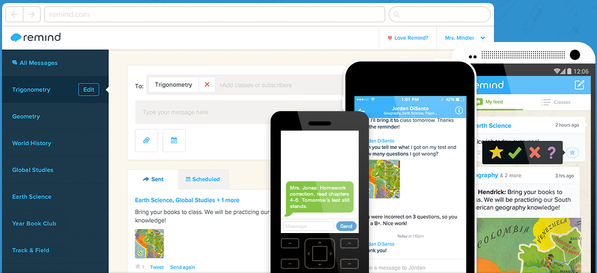Dejamos una de las mejores aplicaciones para el final. Remind tiene tres grandes ventajas, la primera es que tú como maestro, puedas recordarles a tus estudiantes que tienen una tarea pendiente para mañana, o que les sugieras que estudien un tema específico para el día siguiente. La segunda ventaja, es que sus padres también pueden recibir esa misma notificación y estar al tanto de los deberes de sus hijos. Y la tercera ventaja es que la comunicación puede ser bidireccional, incluso por chat, pero no necesitas tener sus números de teléfonos ni ellos el tuyo, para todo esto funciona Remind.