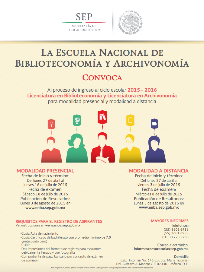 La Secretaría de Educación Pública publicó la convocatoria de ingreso para la Escuela Nacional de Biblioteconomía y Archivonomía (ENBA) para el ciclo escolar 2015-2016, en las disciplinas de Biblioteconomía y Archivonomía, en sus modalidades presencial y a distancia, la cual estará abierta hasta el jueves 16 de julio, y el examen de admisión se llevará a cabo el sábado 18 de julio, en las instalaciones de dicha institución.