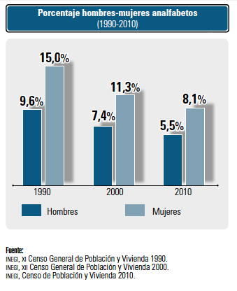 Para el académico de la Universidad Nacional Autónoma de México (UNAM) Hugo Casanova, hoy en día “la situación de analfabetismo en México es dramática”; del total de analfabetas en nuestro país la mayor parte son mujeres, “Los porcentajes de analfabetismo han permanecido casi estáticos a lo largo de una década: 40 por ciento varones, 60 por ciento mujeres”.