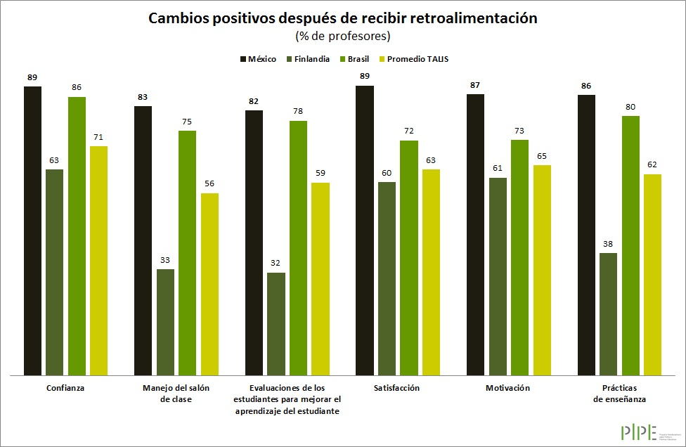 En México, 90.5% de los profesores reporta haber recibido algún tipo de retroalimentación en su escuela actual. Las principales fuentes de retroalimentación provienen del análisis de resultados de los estudiantes y de su enseñanza en el aula (82.1% y 80.6%).