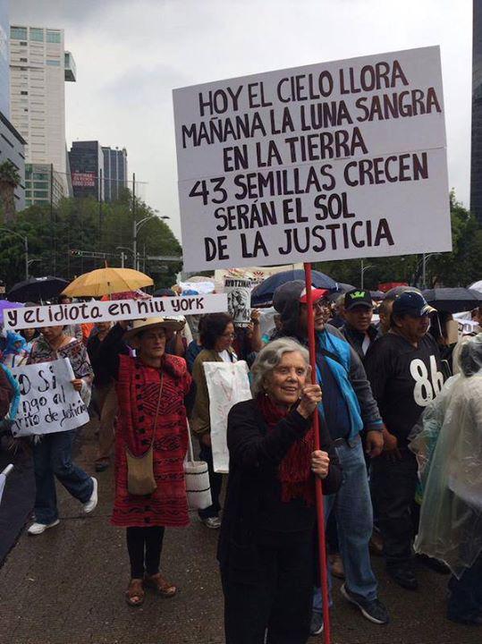 “Llueve, pero no importa. Esta lluvia parece más un llanto del cielo por nuestros 43 hermanos desaparecidos. Sin embargo, nada nos parará; ya estamos cansados de que no exista justicia, no sólo en el caso Ayotzinapa, sino por todas las situaciones que no se han aclarado”.