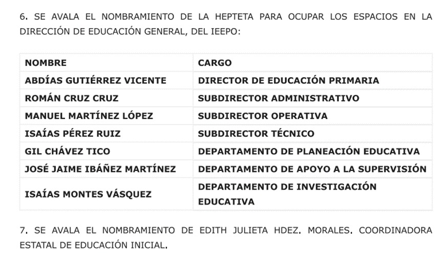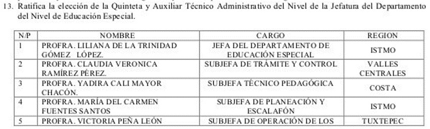 Además, hay múltiples evidencias documentales de que los titulares de las jefaturas de los niveles de educación básica eran designados por la Sección 22. En los acuerdos, pronunciamientos, tareas y plan de acción derivados de la asamblea estatal de marzo de 2004 se avalan los nombramientos de quienes ocuparán la dirección de educación primaria, así como las subdirecciones y jefaturas de departamento. (Imagen 1) En un documento similar, pero de 2013, pueden leerse los nombres de las personas que ocuparán la jefatura y subjefaturas del departamento de educación especial. (Imagen 2)