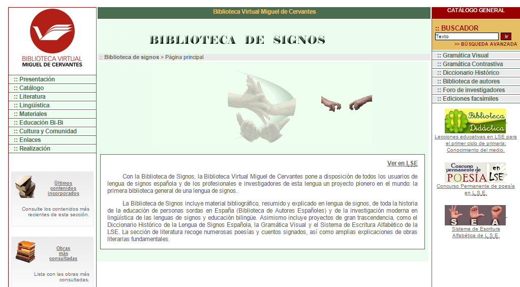 La Biblioteca Virtual de Signos fue pensada para sordos, es un proyecto que se suma a otros, ya puestos en marcha por la Biblioteca Virtual Miguel de Cervantes. En la Biblioteca de Signos pretenden mostrar diferentes publicaciones, a través de las herramientas proporcionadas por las nuevas tecnologías, en lengua de signos española (LSE).