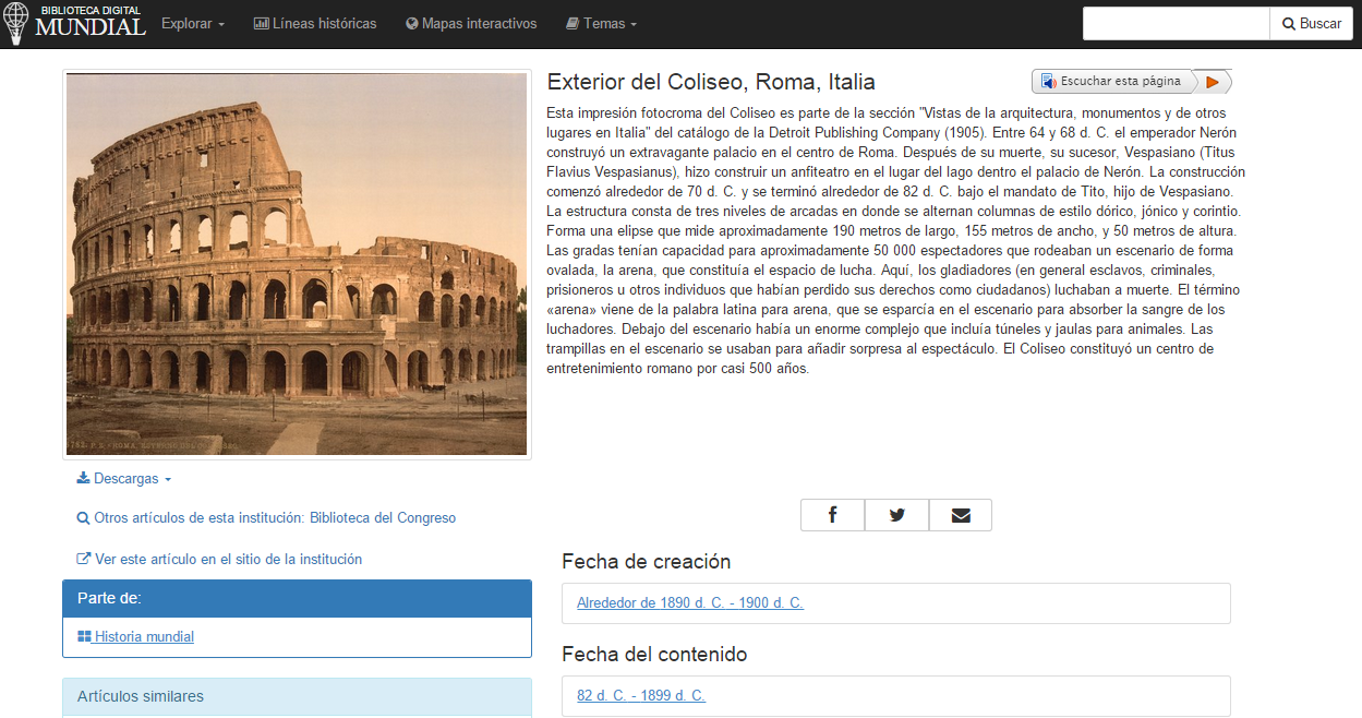 La Biblioteca Digital Mundial pone a disposición de todos, a través de Internet, en formato multilingüe, importantes materiales, fundamentales de culturas de todo el mundo. Es una iniciativa del Congreso de los Estados Unidos, de la ONU y de la UNESCO. Cuenta con mapas interactivos y líneas históricas que convierten en amena la experiencia de aprendizaje. Se encuentra una gran variedad de libros históricos, artículos y mapas de todos los países.