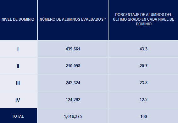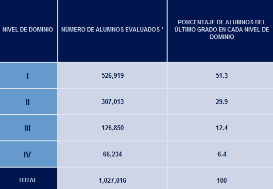 Los resultados demuestran que la mayoría de los estudiantes se encuentra en el nivel I de los resultados. En Matemáticas el 51.3% se encuentra en esta escala, mientras que en habilidades de lenguaje y comunicación es de 41.3%.