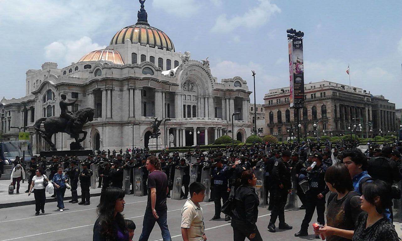 Enfrente del Palacio de Bellas decenas de granaderos esperaron a las y los docentes para impedirles el paso. Los manifestantes incluso intentaron usar un autobús para abrirse paso, pero no lograron que se retiraran los granaderos, lo que causó tensión por algunos minutos.