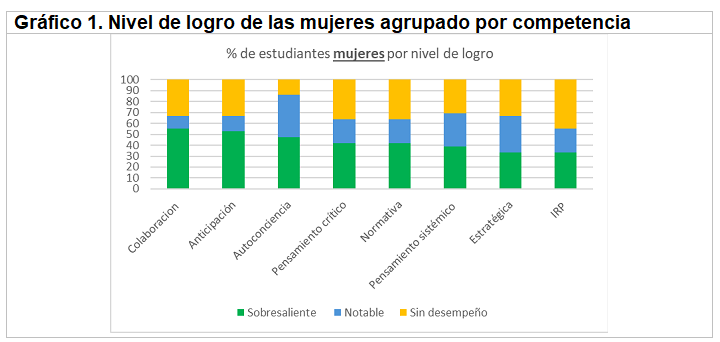 En cuestión de desempeño general, 73% de los estudiantes logró los criterios para aprobar el curso. En particular, hay diferencias en los niveles de logro alcanzados. La mayoría de las mujeres (64%) alcanzó el nivel sobresaliente (ver tabla 1).