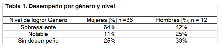 Tabla 1. Desempeño por género y nivel