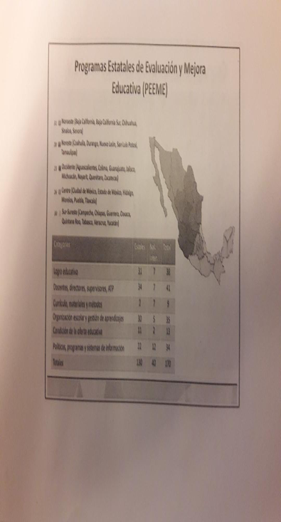 NOTA: va un glosario indispensable: SNEE: Sistema Nacional de Evaluación Educativa/ PNEE: Política Nacional de Evaluación de la Educación (hay que añadir PEEME: Programa Estatal de Evaluación y Mejora Educativa) /SEN: Sistema Educativo Nacional/AE: Autoridades Educativas/ CNSPD: Coordinación Nacional del Servicio Profesional Docente.