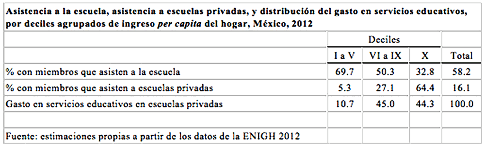 Sin embargo, esta realidad demográfica se ve opacada por el hecho de que la asistencia a escuelas privadas se incrementa considerablemente en los hogares de los deciles altos. De esta manera, a pesar de que en la franja de menores ingresos hay más familias que tienen hijos en la escuela, son menos las que los envían a escuelas privadas: mientras que en los deciles I a V sólo 5.3% de los hogares con estudiantes mandan a sus hijos a escuelas privadas, en los estratos medios (deciles VI a IX) 27.1% lo hacen. En el decil superior los hogares que recurren a las escuelas privadas son una franca mayoría, con una proporción de 64.4%.