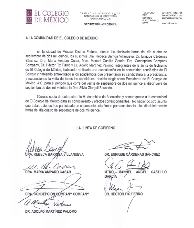 Rebeca Barriga, Enrique Cárdenas, María Amparo Casar, Manuel Castillo, Concepción Company, Héctor Fix y Adolfo Martínez Palomo, integrantes de la Junta de Gobierno, anunciaron su decisión a través de una carta dirigida a la comunidad de esa institución educativa, la cual fue tomada, explicaron: “habiendo realizado una auscultación en la comunidad académica de El Colegio y habiendo entrevistado a los académicos que presentaron su candidatura a la presidencia”.