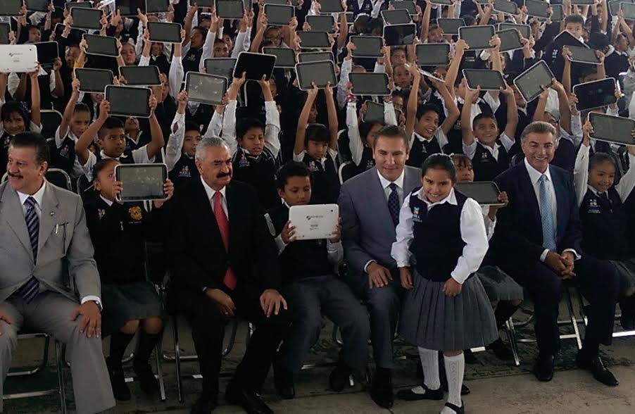 Al inaugurar con el gobernador de Puebla, Rafael Moreno Valle Rosas, el ciclo escolar 2014-2015 en la escuela Amalia Contreras de Lobato, realizó la entrega simbólica de las más de 128 mil tabletas que se distribuirán en la entidad.