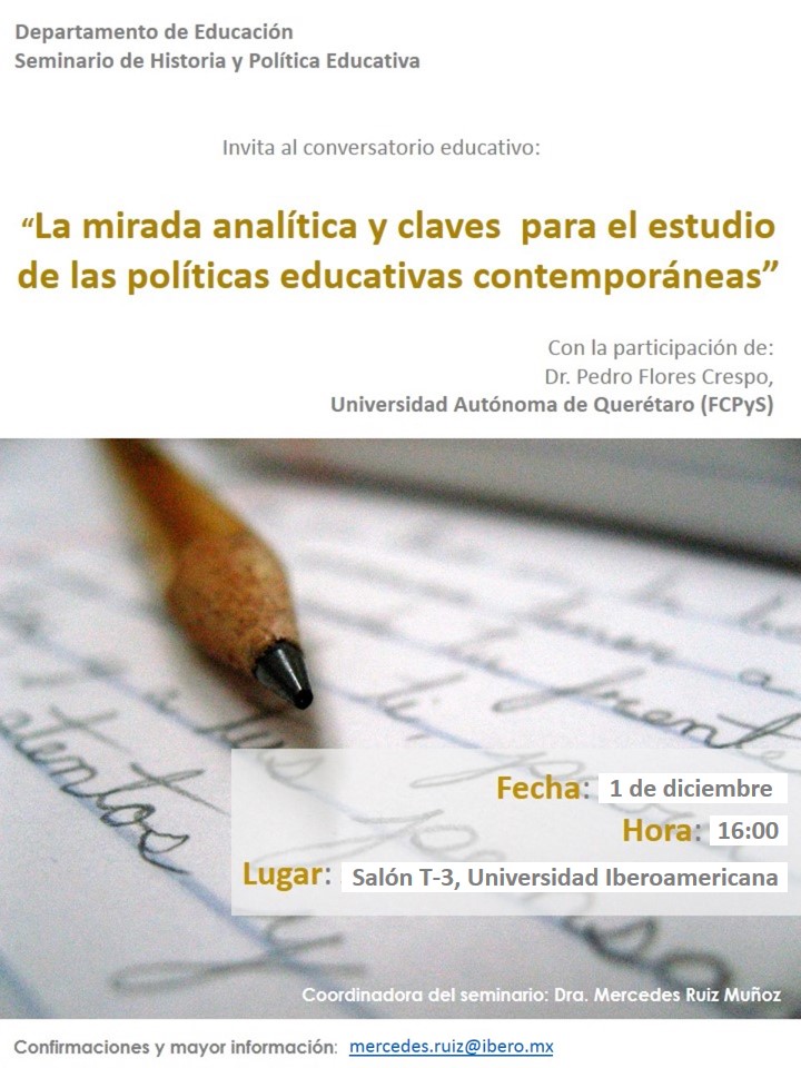 El conversatorio “La mirada analítica y las claves para el estudio de las políticas educativas” se celebrará hoy, martes primero de diciembre, en la Universidad Iberoamericana.