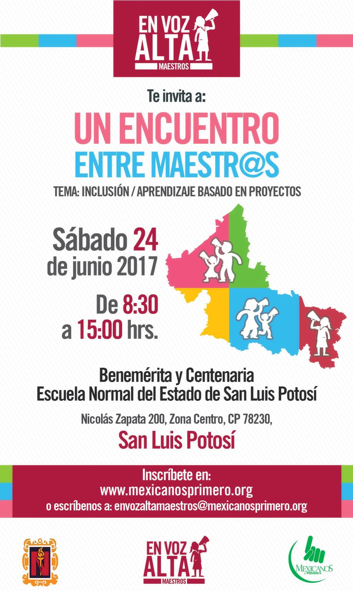 Este próximo EN VOZ ALTA San Luis Potosí se enmarca en el tema de la triple inclusión: estar, aprender y participar (hipervínculo a http://mexicanosprimero.org/images/Tod@s_Baja.pdf) y la metodología de Aprendizaje Basado en Proyectos (ABP). A través de dinámicas de aprendizaje entre pares, reflexiones y talleres, se busca que al final del evento, cada asistente pueda salir esperanzados e inspirados al asumirse como agentes de cambio, enriquecido de ideas, renovados y contagiados de otras prácticas, con la satisfacción de haber aprendido aspectos innovadores y desaprendido de ciertos hábitos de sus colegas (reconocimiento entre pares), que le permitirán adecuarlo a su respectivo contexto escolar.