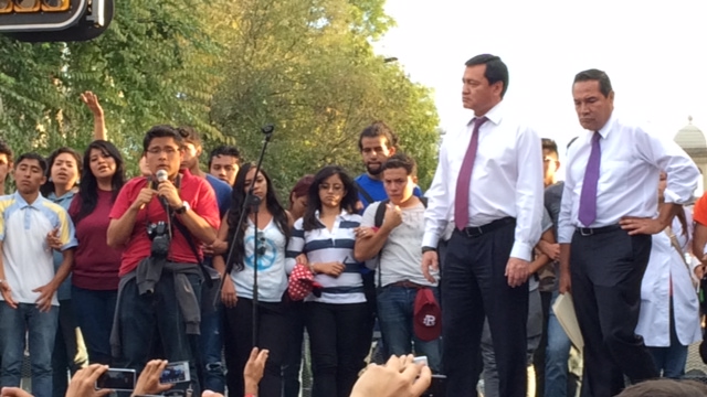 Miguel Ángel Osorio Chong salió a la calle de Bucareli y  desde el templete que los organizadores de la manifestación prepararon a diez metros de la reja resguardada por elementos de la Policía Federal, leyó el pliego petitorio del movimiento estudiantil y propuso una solución inmediata.