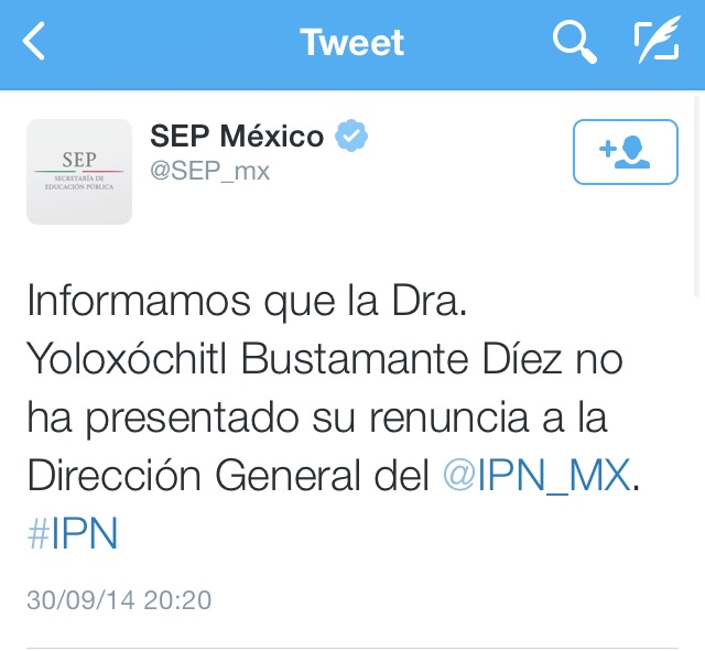 Sobre la destitución de la directora Yoloxóchitl Bustamante, justo en el momento en el cual el secretario de Gobernación se dirigía a los estudiantes se filtró a través de algunos medios de comunicación, una supuesta renuncia por parte de Bustamante Díez; no obstante, este rumor fue desmentido por la Secretaría de Educación Pública (SEP), a través de su cuenta de Twitter.