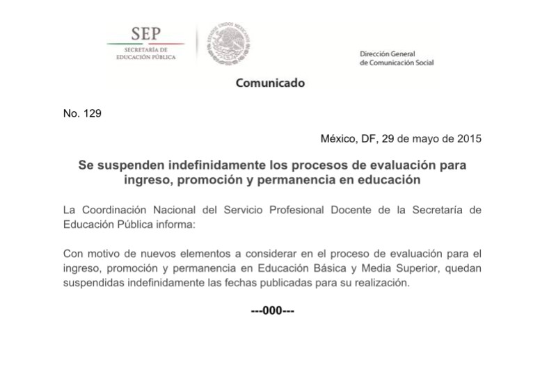 comunicado_sep129¿Cómo no retroceder ante el anuncio por parte de la SEP de la “suspensión indefinida” de las fechas de evaluación del servicio profesional docente? La declaración ha generado desconcierto, escepticismo y desorientación. La tarea educativa es ardua y, cuando las pautas son vacilantes, se hace todavía más compleja. La reciente noticia entorpece el avance de la reforma educativa: en educación, si se quieren tener buenos resultados, no caben improvisaciones ni empeños parciales, porque ante el desconcierto, la desconfianza y la mediocridad crecerán.