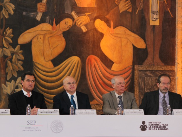 Firmaron el acuerdo Rodolfo Tuirán, Subsecretario de Educación Media Superior, y Alfredo Llorente, Director General del INEA, en las instalaciones de la Secretaría de Educación Pública, en el Centro Histórico.
