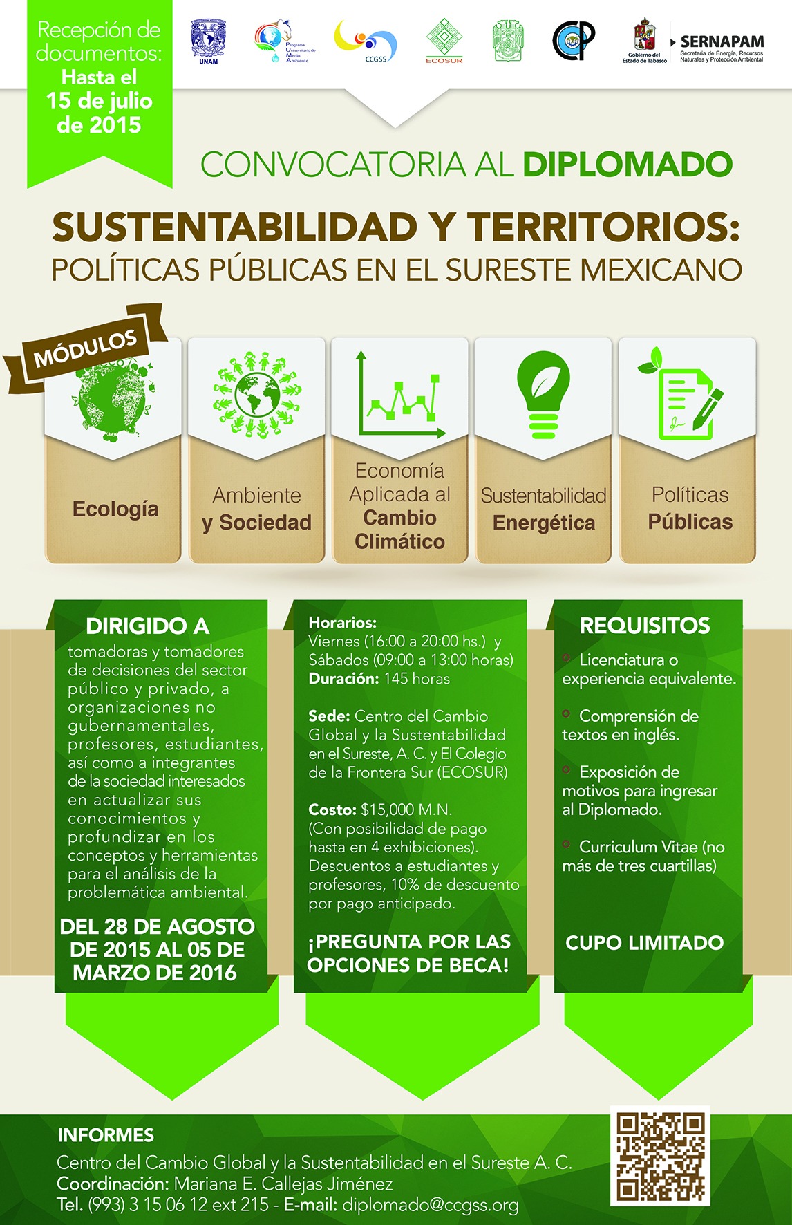 El Centro del Cambio Global y la Sustentabilidad en el Sureste (CCGSS) abrió las inscripciones para el Diplomado Sustentabilidad y territorios: políticas públicas en el sureste mexicano, que impartirá del 28 de agosto de 2015 al 5 de marzo de 2016.