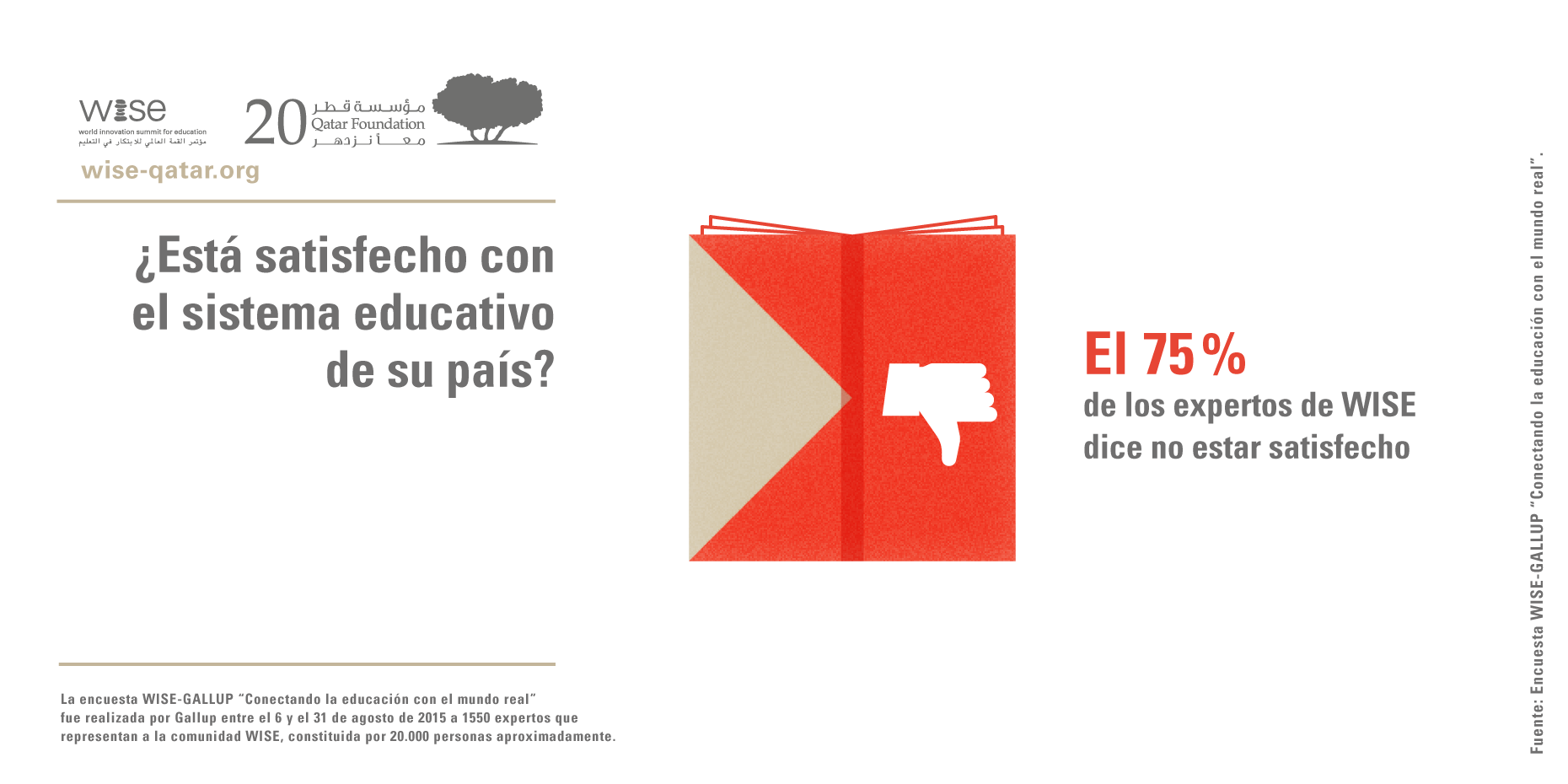 Estas conclusiones provienen de la Encuesta “Conectando la educación con el mundo real” de WISE 2015, realizada por Gallup a través de la web entre el 6 y el 31 de agosto de 2015. La encuesta está basada en las respuestas de 1.550 miembros de la comunidad mundial de WISE: profesores, estudiantes, recién graduados, responsables políticos en materia de educación y miembros del sector privado conectados con WISE a través de los años en temas de reforma educativa. Los resultados reflejan los puntos de vista de esta comunidad única y global de expertos que han demostrado un compromiso en la mejora de la educación en colaboración con WISE.