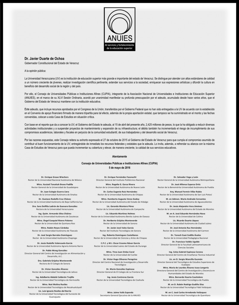 Entre los firmantes del documento de la CUPIA, que destaca la situación crítica de la UV, se encuentran Enrique Graue, Rector de la UNAM; Enrique Fernández Fassnacht, Director General del IPN; Salvador Vega y León, Rector General de la UAM; Jaime Valls, Secretario General Ejecutivo de la ANUIES; y Francisco Valdés Ugalde, Director General de Flacso.
