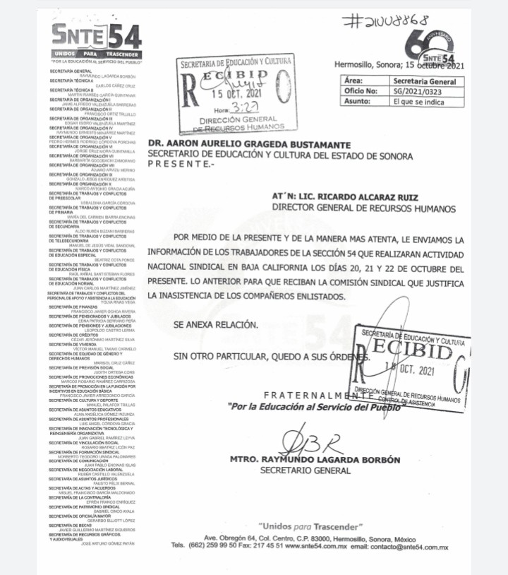 Mediante el oficio DGRH/5277/2021 emitido por la Secretaría de Educación y Cultura del Gobierno de Sonora y firmado por Ricardo Alcaraz Ruiz, director general de Recursos Humanos, se autoriza a 123 docentes ausentarse de sus actividades para participar en los procesos sindicales de Baja California los días 20, 21 y 22 de octubre.