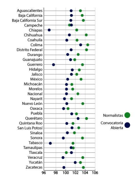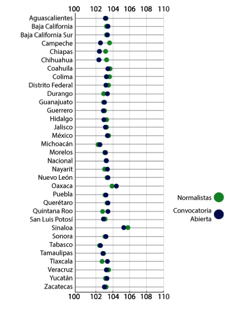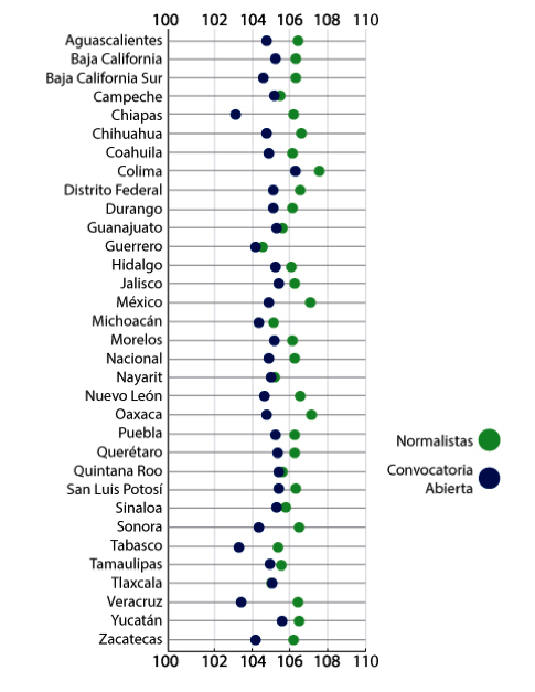 A nivel nacional, el puntaje de los normalistas es significativamente superior al puntaje promedio de los sustentantes de convocatoria abierta. En la gráfica 1, podemos observar el puntaje promedio de normalistas y sustentantes de convocatoria abierta por estado y observar que en la mayoría de ellos, los normalistas salen mejor evaluados. Sólo existen tres excepciones: Campeche, Oaxaca y Tlaxcala, donde no existe diferencia significativa. Sin embargo, hay que tomar con cautela los resultados de Oaxaca, dado que el tamaño de la muestra en este primer concurso de oposición puede ser no representativo y positivamente sesgado, dada la historia de los 123 sustentantes oaxaqueños en este primer concurso.
