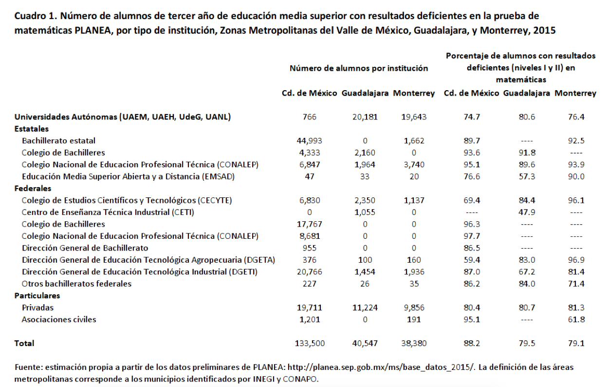 Otro resultado que llama la atención es que las calificaciones deficientes predominan en prácticamente todas las instituciones. En la gran mayoría de las modalidades o subsistemas no se garantizan siquiera niveles promedio de deficiencia menores a 50%. Esto incluye a los bachilleratos de las dos grandes universidades públicas de Guadalajara (UdeG) y Monterrey (UANL), que a pesar de presentarse a sí mismas como instituciones públicas de vanguardia nacional (y cobrar cuotas “voluntarias” significativas, como es el caso de algunas preparatorias de la UANL que llegan a solicitar hasta 6,000 pesos semestrales), no garantizan niveles aceptables de matemáticas ni siquiera para una cuarta parte de sus alumnos.