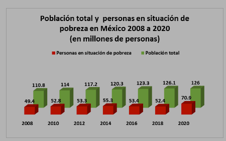 Como puede observarse en la gráfica 3, en México, el número de personas en situación de pobreza pasó de 49.4 millones en 2008 a 70.9 en 2020, es decir, en 12 años se incrementó en 21.5 millones de personas.