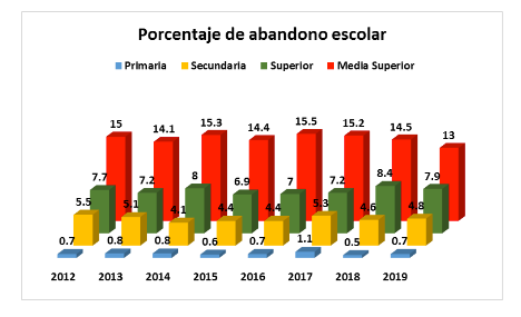 Según los datos históricos siguientes (ver Gráfica 2), en promedio, entre 2012 y 2019, 14.6% de los estudiantes de educación media superior, 7.5% de los de educación superior, 4.8% de los de secundaria y 0.7% de los de primaria abandonaron la escuela. Estos datos nos muestran que históricamente han abandonado más la escuela los alumnos de educación media superior, después los de educación superior y menos los de secundaria y primaria.