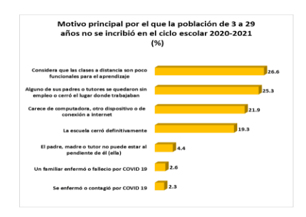 Según la encuesta ECOVID-ED para la medición del impacto de la Covid 19 en la Educación, realizada por el INEGI (2021), los estudiantes no se inscribieron por razones asociadas a la Covid-19 como el hecho de que alguno de los padres o tutores quedaron sin trabajo, o por falta de dinero o recursos para comprar un dispositivo electrónico (como una tv, computadora, celular, tableta o pagar la internet o la luz).