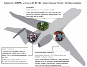 Empero, la novedad en esta ocasión no es la tomadura de pelo. En todo caso, ella está en lo que el Estado pretende para la población de Atenco y demás municipios mencionados. Es decir, él ha definido cuál será su proyecto de vida y desarrollo: de otrora dueños de las tierras, a asalariados que se emplearán en lo que se construirá en y alrededor de lo que era suyo. Vendedores de fuerza de trabajo que, por lo demás, deberán ser capacitados. Lo que incluye a la educación pos básica. No es para menos, pues en la sociedad del conocimiento, la inclusión es determinante para competir (Brunner, 2001). La ilustración siguiente permite representar la visión estatal para la población en cuestión: