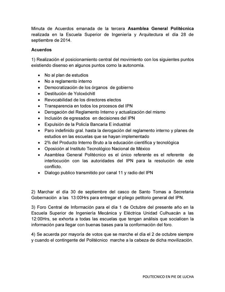 En el 2002 ya se había propuesto la autonomía al IPN, la cual fue rechazada por la comunidad; no obstante, esta propuesta se ha retomado y se comiena a impulsar desde el movimiento estudiantil, que marchará este 30 de septiembre del Ángel de la Independencia a la Secretaría de Gobernación, para entregar su pliego petitorio, el cual puedes consultar dando click aquí: (1,2, 3)
