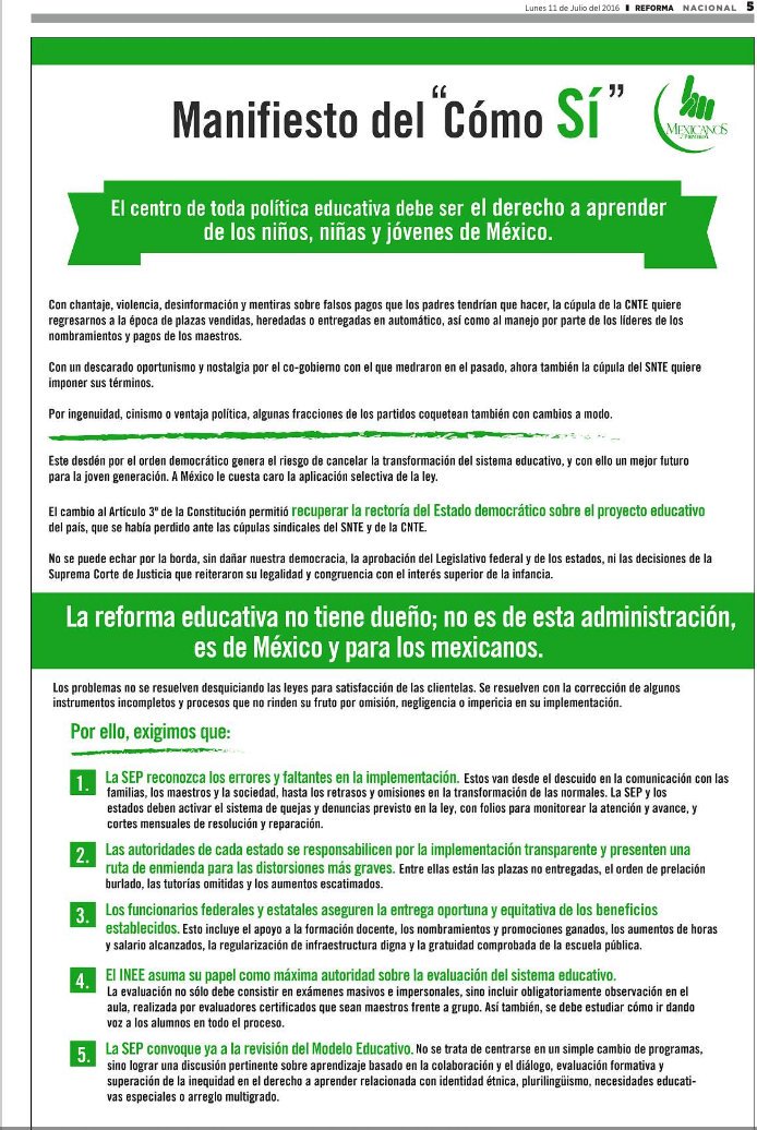 Mientras que denunció el “descarado oportunismo” del SNTE, así como su “nostalgia por el co-gobierno con el que medraron en el pasado”. Mexicanos Primero criticó que fracciones de partidos políticos coqueteen con cambios a modo “por ingenuidad, cinismo o ventaja política”.