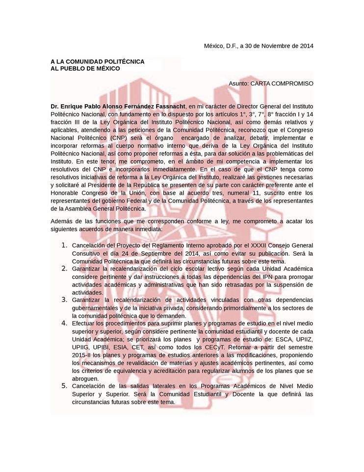 “En el Caso de que el CNP, tenga como resolutivos Reformas a la Ley Orgánica del Instituto, realizaré las gestiones necesarias y solicitaré al Presidente de la República se presenten de su parte con carácter preferente ante el Honorable Congreso de la Unión”, se puede leer en la carta que propondrán este martes los estudiantes politécnicos.