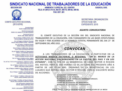 El Instituto Estatal de Educación Pública de Oaxaca (IEEPO) presentó hoy, 30 de septiembre, denuncias penales ante la Procuraduría General de la República (PGR), y la Fiscalía General del Estado de Oaxaca contra dirigentes magisteriales de la Sección 22 de la Coordinadora Nacional de Trabajadores de la Educación (CNTE) por apología del delito.