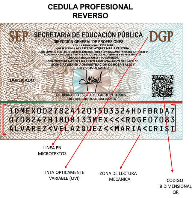 Entre las nuevas características de la cédula, elaborada por los Talleres Gráficos de México, destacan: un diseño estructural con grabado en alto y bajo relieve de forma horizontal; datos de identificación del titular de fácil acceso en el anverso, tales como número de cédula, nombre, profesión o grado y la CURP; en el reverso, código bidimensional (QR) y zona de lectura mecánica; así como un elemento holográfico.