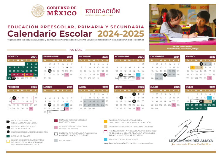 El calendario de 190 días efectivos de clase, aplicable para las escuelas de Educación Básica de las 32 entidades del país, establece que el inicio del ciclo lectivo será el lunes 26 de agosto de 2024 y concluye el miércoles 16 de julio de 2025.
