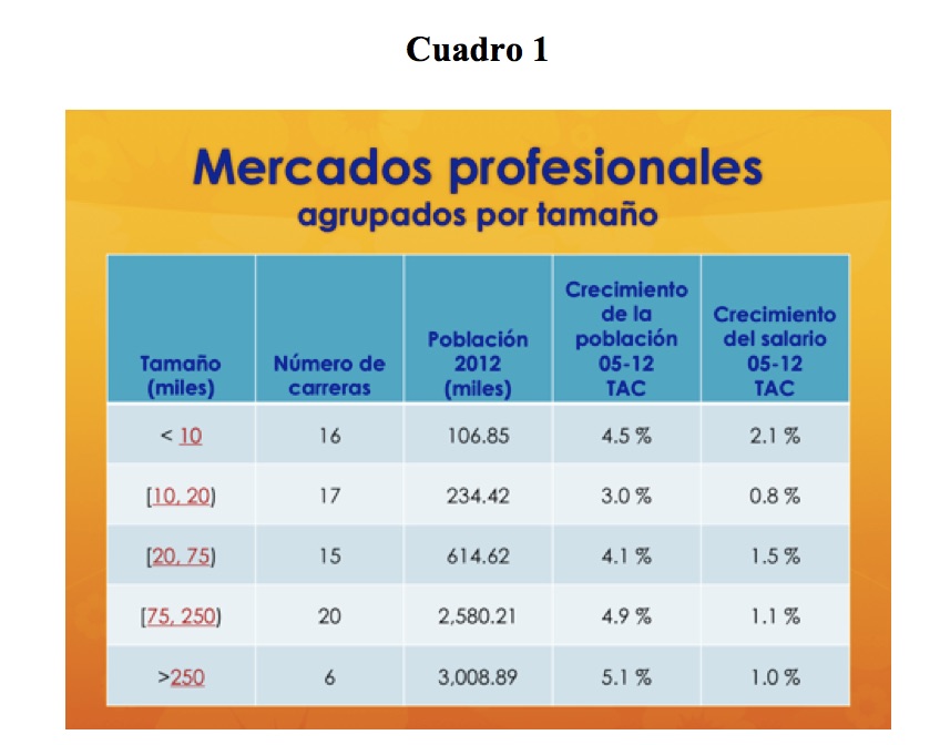 El cuadro 1 es un resumen del crecimiento de los mercados laborales de los que se tiene registro en México. Leyes, Administración, Negocios, Contaduría, Psicología, Ingeniería Industrial, Comunicación y otras, que definen lo que se conoce como las carreras saturadas, pertenecen a los dos mercados más grandes. Después de su tamaño, la siguiente característica que los define es su gran dinámica. Son los que más crecen. Ergo, los que más profesionales absorben, ergo por los que mayor demanda muestra el mercado, ergo los que mayores señales muestran de vitalidad. Ergo, donde no hay forma de sostener que están saturados.