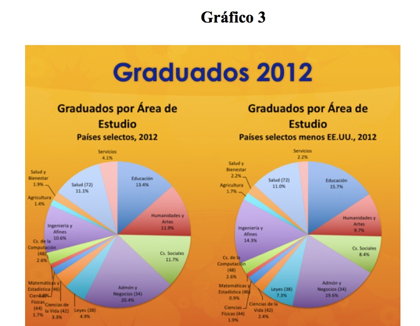 En México hay tantos administradores como en EE.UU. Entre Leyes, AyN, Ciencias Sociales y HyA, tanto en México como en los países industrializados, incluyendo Corea, los egresados de estas áreas representan alrededor del 50% del total. Sin embargo, la enorme diferencia está en la composición interna. En México el porcentaje de egresados en HyA es exiguo, cuando menos.