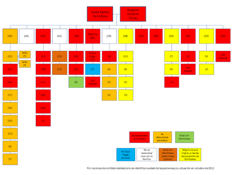 Luego se lo llevó la ola de la violencia, a la que estaba gravemente expuesto. Para finales de 2012 habían desaparecido 26 integrantes de la familia Cisneros de la Rosa a manos de comandos armados, sin que ninguna autoridad se diera por enterada a pesar de los reiterados llamados a tomar medidas especiales para proteger a niños y adultos de esta familia. (Adjuntamos esquema sobre la situación de cada miembro de la familia como era conocido en octubre de 2012).