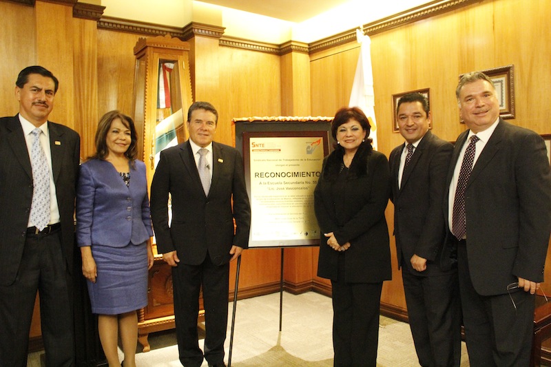 El presidente nacional del SNTE, Juan Díaz de la Torre, otorgó la placa distintiva a la directora del plantel, Irene Villafuerte Elizondo, quien ha logrado colocar a esta escuela pública como una de las mejores del mundo.
