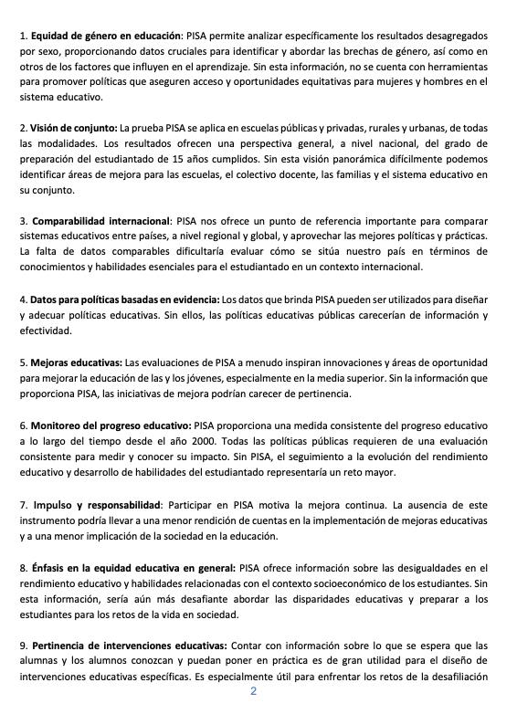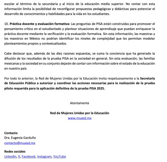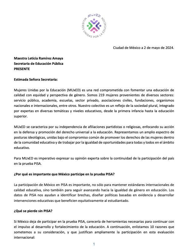 Ante la posible suspensión temporal de la prueba PISA en México, la red “Mujeres Unidas por la Educación” exhortó a la Secretaría de Educación Pública (SEP) a mantener y realizar las acciones necesarias para que el examen piloto se aplique en el país, afirmando que más allá de ser una evaluación que monitorea el progreso educativo, la mejora continua y la evaluación formativa, aporta datos desagregados por sexo, cuyo análisis es crucial para promover políticas educativas equitativas que aseguren la igualdad de oportunidades para mujeres y hombres en el sistema educativo.
