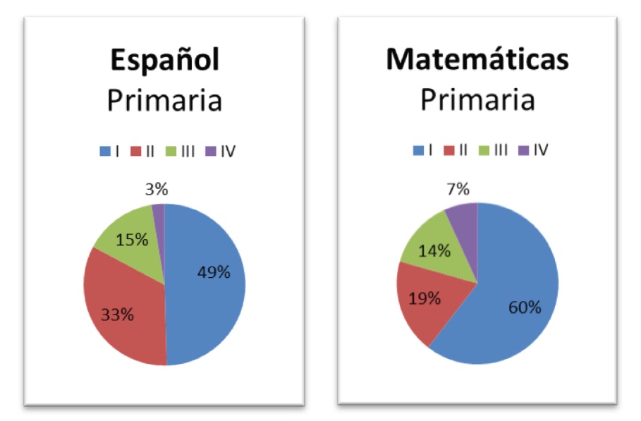 En la mirada general, hay una situación que apunta hacia los bajos niveles de rendimiento en las dos principales asignaturas, a las que se les destina mayor carga horaria y actividades. Los resultados que puntualmente presentó (Educación Futura, 6/11/2015), desde el mismo día en que aparecieron, ahora los mostramos en forma gráfica, para apreciar la distribución de los porcentajes de los resultados en los cuatro niveles.
