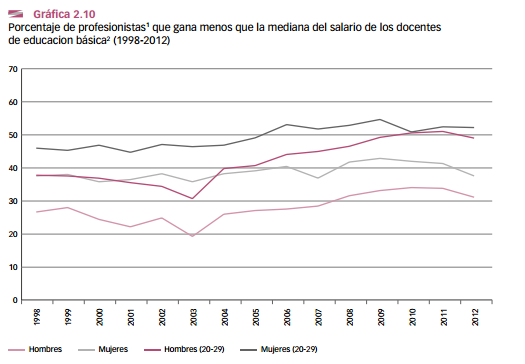 Desde 2005, más de 50% de las mujeres de 20 a 29 años en ocupaciones diferentes a la docencia gana menos que las maestras. Entre los docentes varones del mismo rango de edad, este fenómeno sucede a partir de 2008. En ambos casos, las diferencias podrían explicarse por el deterioro salarial que están experimentando los profesionales.