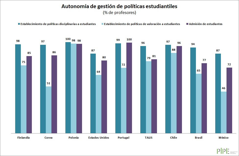 Las secundarias mexicanas reportan los niveles más bajos de autonomía escolar en políticas estudiantiles, sobre todo en establecimiento de políticas para la valoración de sus estudiantes.