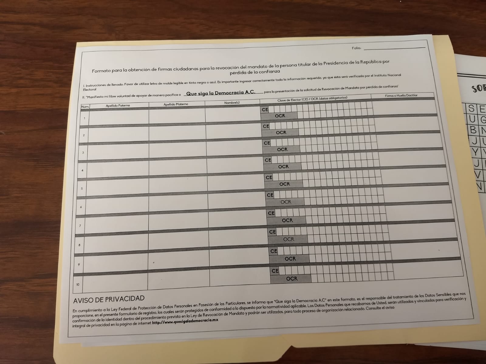 Por medio de la estructura sindical, el SNTE ha enviado a sus agremiados el documento donde se les solicita nombre completo y clave de elector, presionando a contribuir con las firmas para que proceda la consulta.