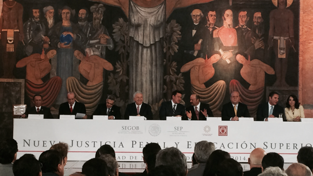 Reunidos en el salón Hispanoamericano de la Secretaría de Educación Pública (SEP), el secretario de Gobernación, Miguel Osorio Chong, el secretario general de la Asociación Nacional de Universidades e Instituciones de Educación Superior (ANUIES), Enrique Fernández Fassnatch, y el jefe de gobierno del Distrito Federal, Miguel Ángel Mancera, firmaron el convenio que compromete a las casas de estudio a modificar sus planes y programas para adecuarlos al nuevo sistema penal mexicano.